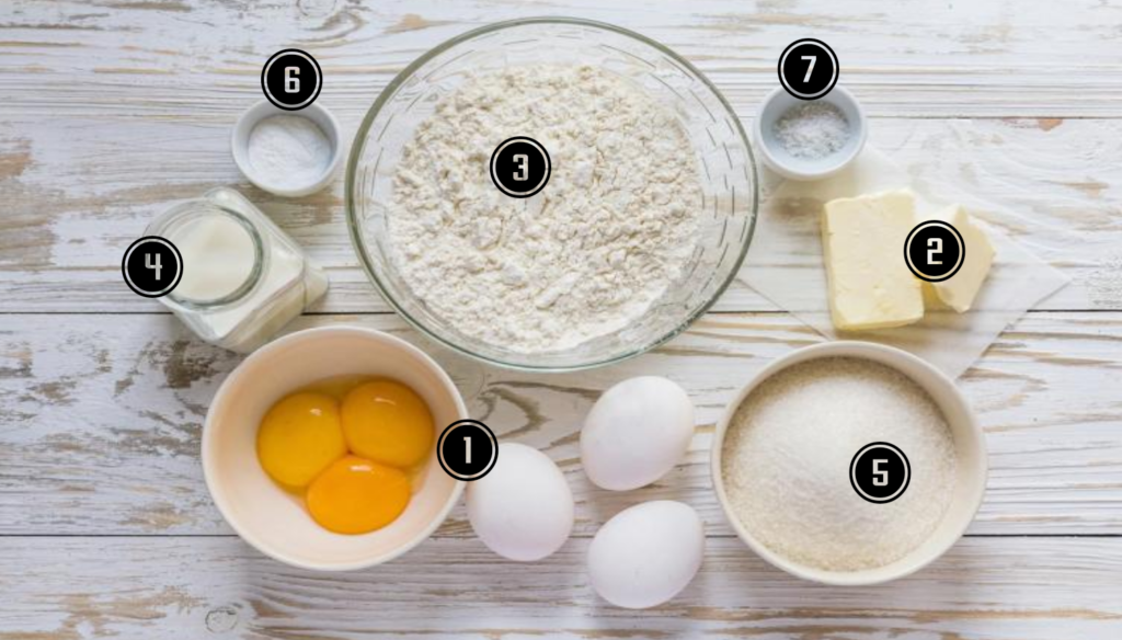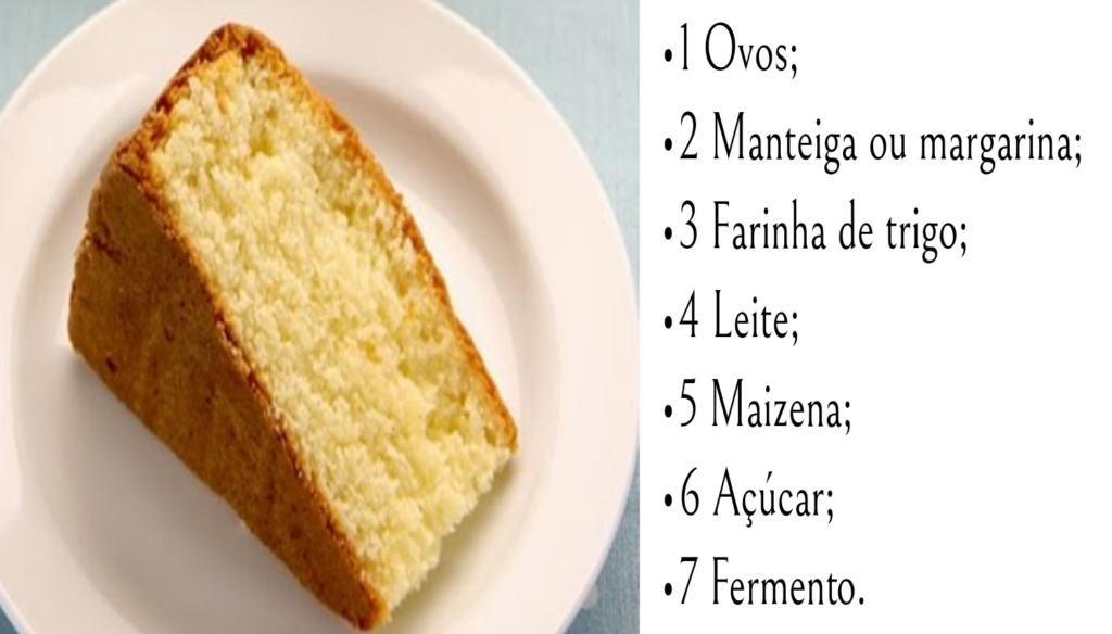 •1 Ovos; •2 Manteiga ou margarina; •3 Farinha de trigo; •4 Leite; •5 Maizena; •6 Açúcar; •7 Fermento.
