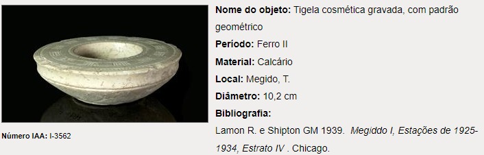 Graças aos pesquisadores e a arqueologia que conseguem montar e provar uma história do passado, que hoje conseguimos entender a mente e cultura de uma civilização mais antiga. Eu arrisco dizer que o oriente “berço” da humanidade é o local que mais sofreu pesquisas, escavações (Egito, Jerusalém). E numa dessas pesquisas foram encontrado diversos materiais diversos “vasos, armas, objetos para cosméticos” que se encontra no museu de Jerusalém. Veja alguma dessas descobertas abaixo: Fonte