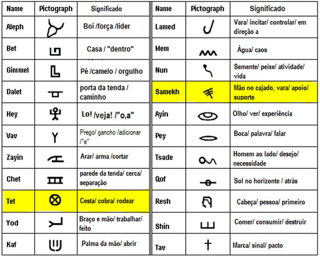 A imagem pictográfica da letra Samech é um suporte, ou seja, para apoiar. A pictográfica de Tet é uma “serpente”. Colocando as duas letras na antiga forma pictográfica juntas, alude a, ‘apoiar a serpente!’ Em outras palavras, através do apoio a serpente (apoiando ou indo junto com argumentos) Adam e Chava (Eva) perderam suas peles de luz e tiveram que ser dado a eles peles de carne e sangue. *