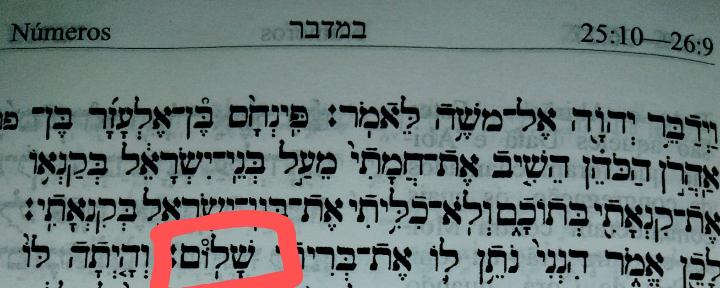 O Santo Bendito Seja Ele, fala que Pin’chas era zeloso como ele, pois está escrito: “No zelo dele meu zelo”. Fazendo uma leitura superficial desse texto, não percebemos que há algo acontecendo nos bastidores no hebraico. No hebraico, a palavra para paz é Shalom [ שלום ]. É escrita com quatro letras hebraicas: shin ש -lamed ל -vav ו -mem sufit ם. Neste caso, no entanto, uma das letras é escrita de forma incomum. Nesta passagem, a palavra Shalom [ שלום ] é escrita defeituosamente com um vav [ ו ] quebrado, no rolo padrão da Torah. A letra vav é cortada ao meio.