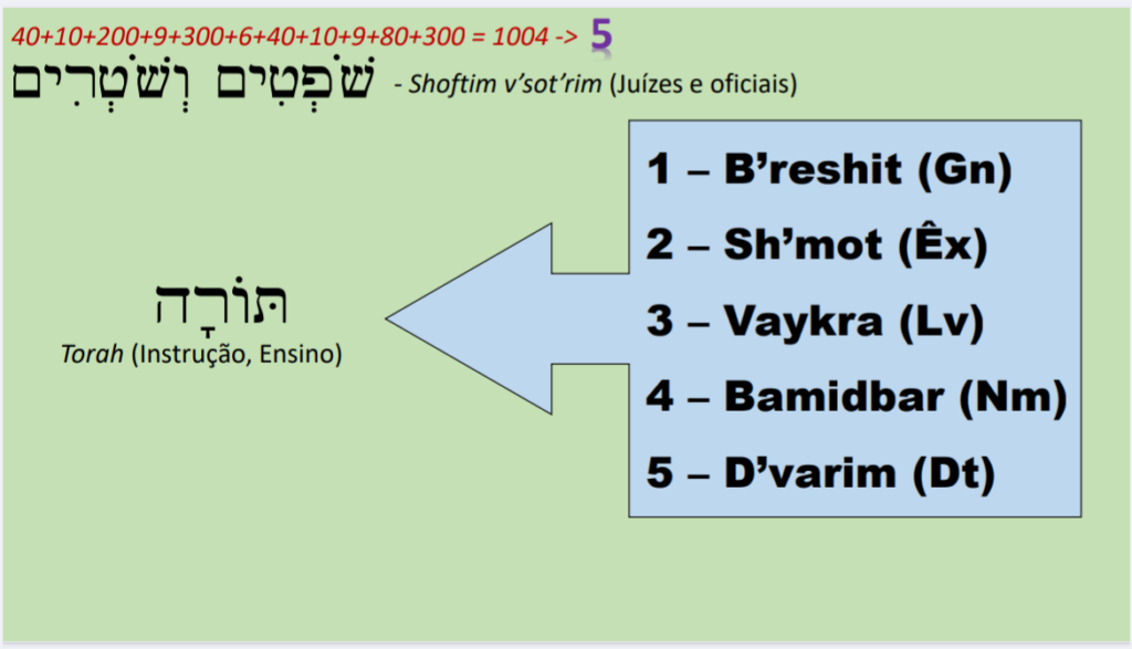 A gematria final da frase “Shof’tim v’sot’rim (שפטים ושטרים) juízes e oficiais é 5, exatamente o número de livros da Torah.
