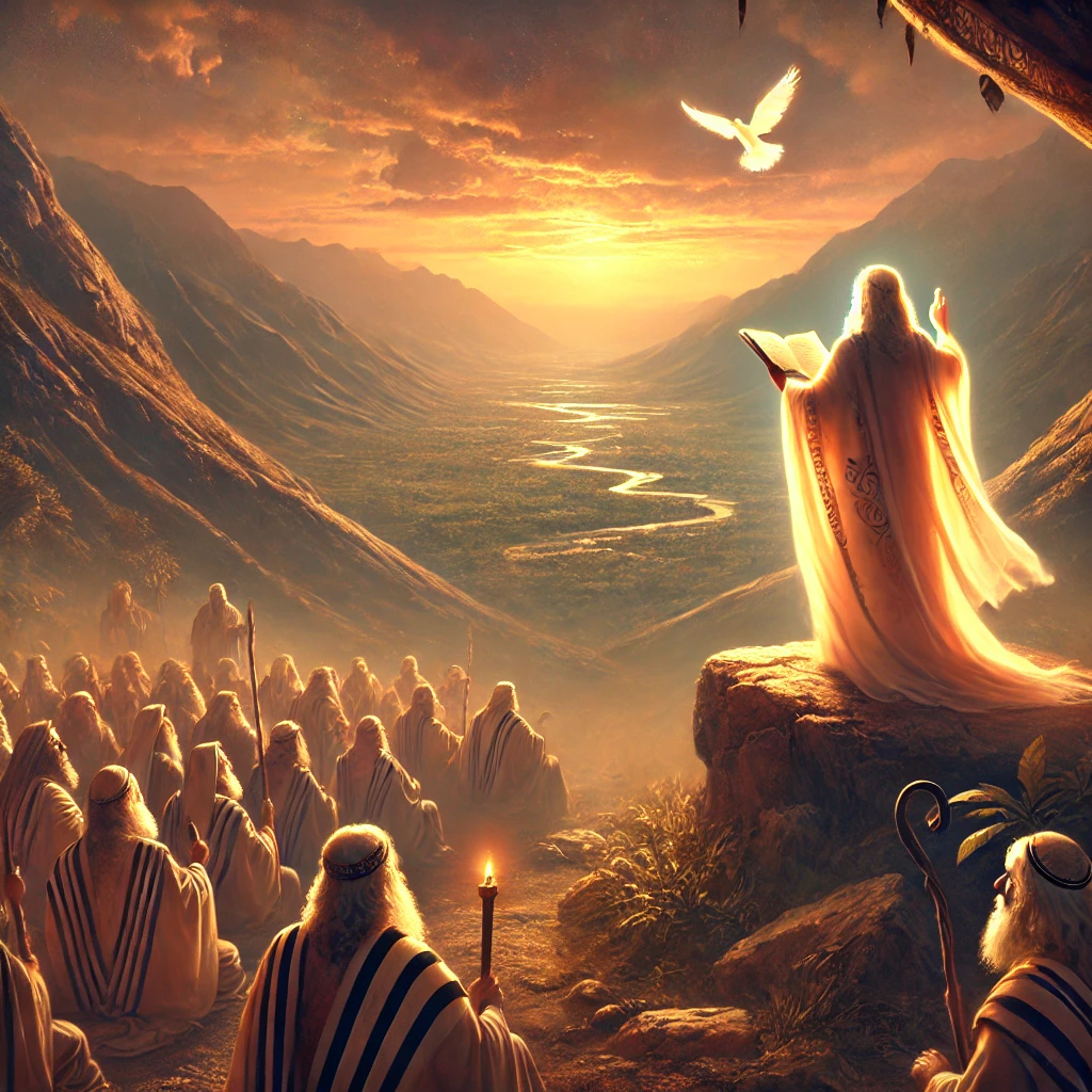 Moisés sobe ao Monte Nebo, onde Deus lhe mostra a Terra Prometida. Ele vê a Terra, mas não entra, cumprindo a promessa de que ele não veria o cumprimento de sua missão “em vida”.